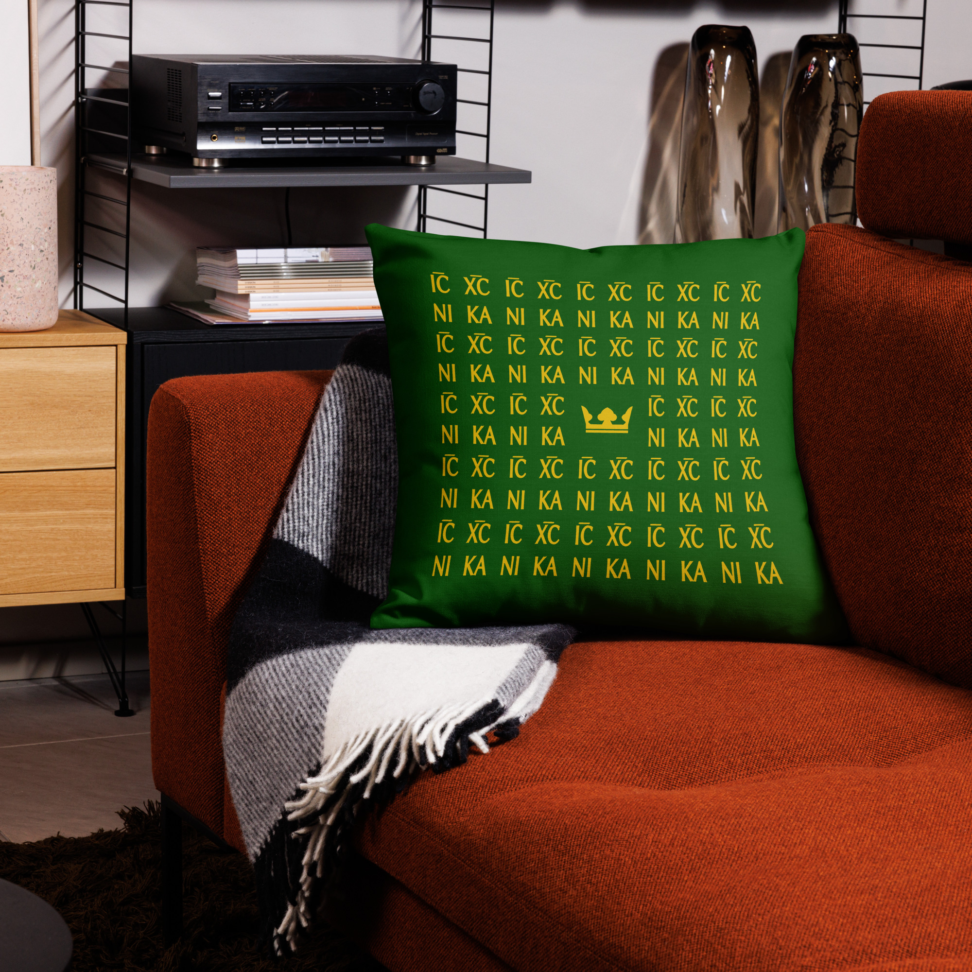 Rest in the LORD because he conquered death. This Royal Green Premium Pillow has a powerful message: “IC XC NI KA”. This is widely used greek monogram and means “Jesus Christ Conquers”. This christian statement is symbolized with an additional crown in the middle. Bring the royalty of Jesus Christ into your home and comfort yourself withn his win.
